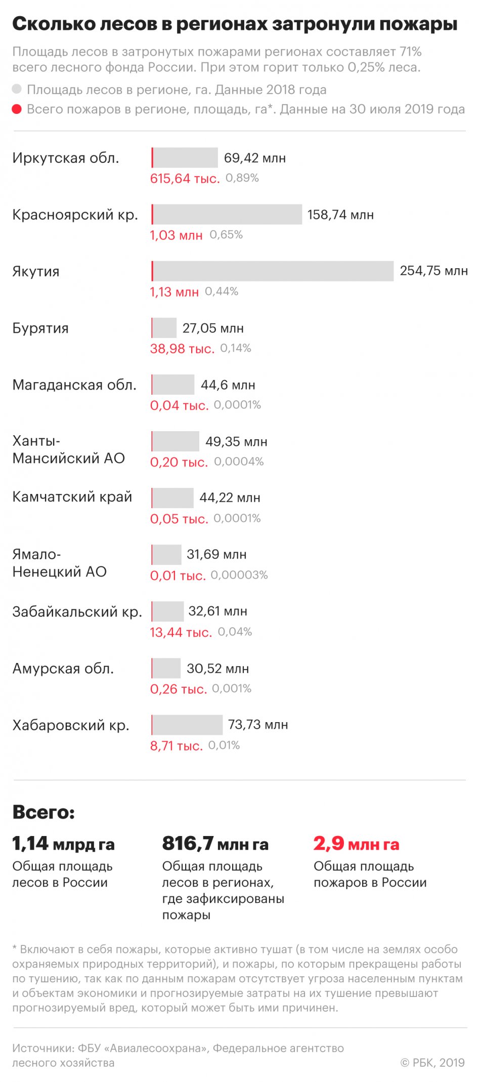 При этом с начала 2019 года до конца июля общая площадь всех зафиксированных лесных пожаров (и не все эти леса являются уничтоженными) составляет 8,82 млн га. Этот результат не слишком сильно отличается от аналогичного периода прошлого года — за семь месяцев 2018-го огнем было затронуто 8,4 млн га (за весь прошлый год — 8,67 млн га).