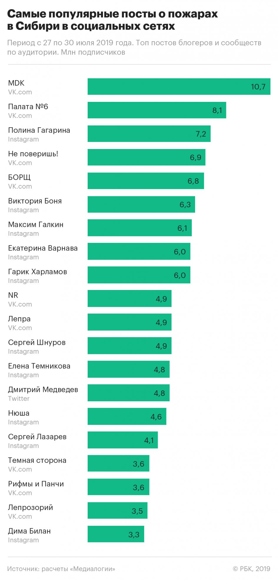 Количество сообщений пользователей о пожаре превысило миллион за последние две недели. К кампании #CпаситеСибирь присоединились десятки популярных блогеров и пабликов, а петицию с требованием ввести режим ЧС на территории Сибири по состоянию на 17:00 мск 31 июля подписали уже более 830 тыс. человек.