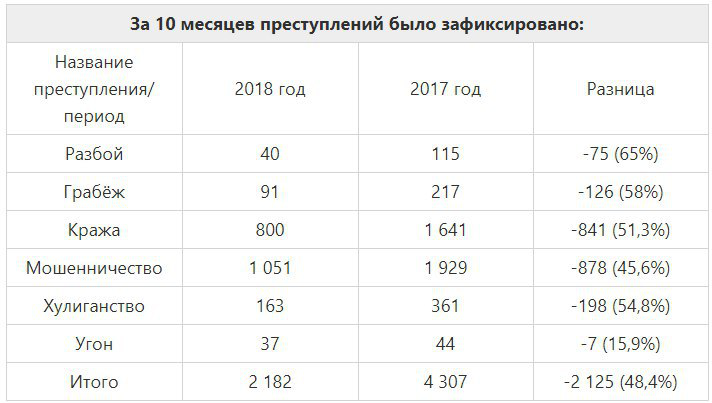 Наилучшие показатели по снижению преступлений связаны с разбоем — 65%. На 58% меньше стало случаев грабежа. Количество фактов, связанных с хулиганством, сократилось на 54,8%.