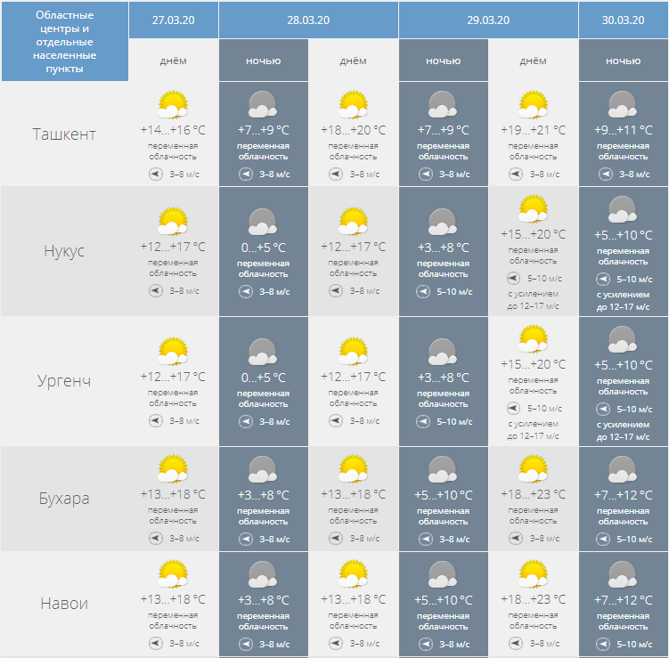В выходные и в самом начале следующей недели жителей Узбекистана ожидает сухая и преимущественно солнечная погода. Температура воздуха постепенно будет повышаться и к понедельнику достигнет пределов 22-25 градусов тепла, по югу до 27 градусов тепла и на 6-9 градусов превысит климатическую норму этих дней.