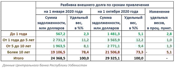 По данным Центрального банка, доля внешнего долга со сроком привлечения свыше 10 лет на 1 октября 2020 года составляет 73,3 процента. Но то, что большая часть государственного долга подлежит погашению через 10 и более лет не должно успокаивать. Ситуация меняется очень быстро.