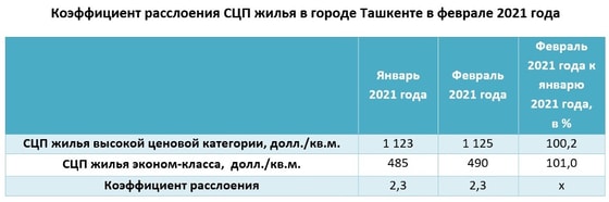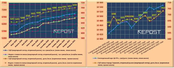Индекс стоимости жилья (средняя цена предложения, скорректированная на усреднённый размер дисконта или скидки при совершении сделок между продавцами и покупателями квартир) в феврале 2021 года по сравнению с уровнем предыдущего месяца вырос в долларовом выражении на 0,5 % до значения 659 долларов/кв. м, а в сумовом, соответственно, на 0,7 % и 6 940,6 тысячи сумов/кв. м.