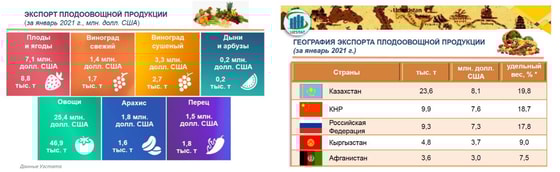 В январе 2021 года доля плодоовощной продукции в общем объёме экспорта составила 5,9 %. Основные рынки экспорта плодоовощной продукции приходятся на Россию, Казахстан, КНР, Россию, Кыргызстан и Афганистан. В стоимостном выражении наибольшая часть экспорта плодоовощной продукции приходится на Казахстан (19,8 % от всего объёма вывоза плодоовощной продукции), Китай – 18,7 % и РФ – 17,8 %.