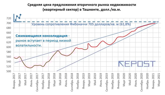 В результате в феврале 2021 года средняя цена предложения жилья на вторичном рынке (квартирный сектор) даже не смогла протестировать уровень сопротивления Фибоначчи 705 долларов/кв. м (61,8 %). Но рынок постепенно подходит к этому уровню сопротивления и консолидируется.