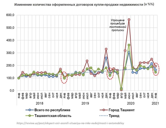 В январе 2021 года количество зарегистрированных в Узбекистане договоров купли-продажи объектов недвижимости по сравнению с январём 2020 года увеличилось на 17,9 %. В городе Ташкенте, на который приходится более 30 % от числа зарегистрированных сделок купли-продажи в стране, этот показатель составил 26,9 %.
