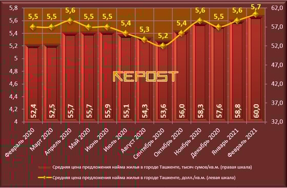 - Средняя стоимость найма квартир в феврале 2021 года в Ташкенте повысилась на 1,8 % (до уровня 5,7 доллара/кв. м). В национальной валюте стоимость найма квартир также увеличилась по сравнению с январём 2021 года на 2,0 % и составила 60,0 тысячи сумов/кв. м.