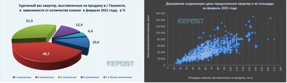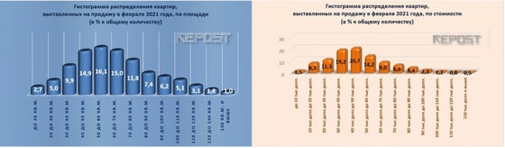 Почти 58 % квартир, выставленных на продажу в феврале 2021 года, имели общую площадь от 40 до 79 квадратных метров. Это средняя площадь типовых двух- и трёхкомнатных квартир. Именно этот сегмент занимает более 51 % квартирного рынка с ценами продаж 20-49 тысяч долларов: 11,3 % занимают квартиры с ценами предложения от 20 до 30 тысяч долларов; 19,2 % - с ценами предложения 30-39 тысяч долларов и 20,7 % - от 40 до 50 тысяч долларов.