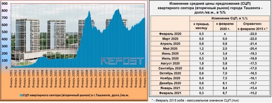 В феврале 2021 года средняя цена предложения (СЦП) жилой недвижимости (квартирный сектор, вторичный рынок) города Ташкента составила 699 долларов/кв. м. Это на 0,3 % выше уровня аналогичного показателя предыдущего месяца (в январе 2021 года прирост составил также 0,3 %).