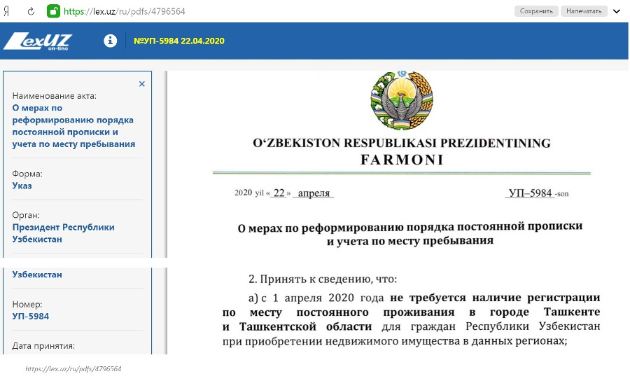 По информации Министерства юстиции, согласно указу Президента о реформировании системы прописки, с 1 апреля 2020 года граждане без постоянной прописки в городе Ташкенте и Ташкентской области получили возможность приобретать недвижимость.