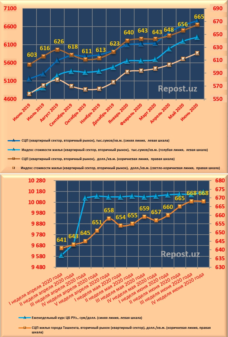 - Индекс стоимости жилья в квартирном секторе (вторичный рынок) в июне 2020 года в столице составил 621 доллар/кв.м. (темп прироста по сравнению с маем 2020 года составил 1,5%) или 6 312,5 тысячи сумов/кв.м. (темп прироста по сравнению с предыдущим месяцем составил 1,8%).