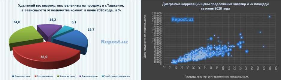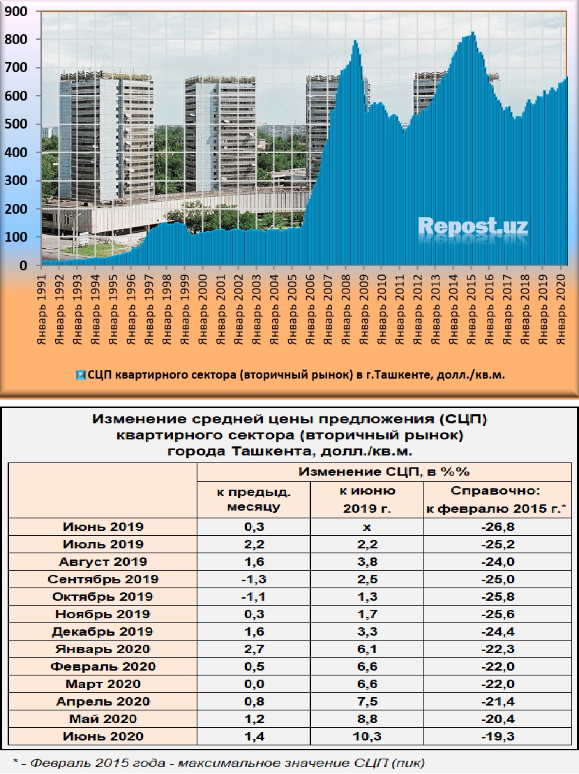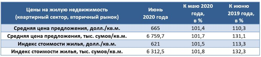 В июне 2020 года средняя цена предложения (СЦП) жилой недвижимости (квартирный сектор, вторичный рынок) города Ташкента составила 665 долларов/кв.м. Это на 1,4% выше уровня предыдущего месяца.