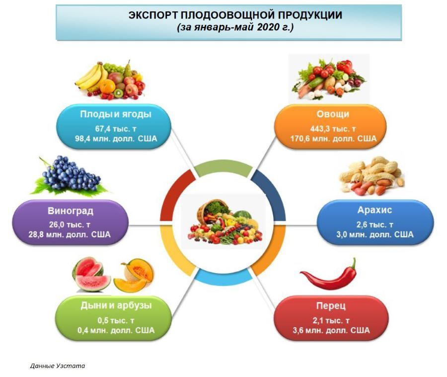 Девальвация повлияла и на объёмы выручки от экспорта плодоовощной продукции. По данным Узстата за январь-май 2020 года объем экспорта плодоовощной продукции в натуральном выражении составил более 542,4 тысячи тонн и в стоимостном выражении превысил 305,1 млн долларов (темпы снижения по сравнению с аналогичным периодом 2019 года составили, соответственно, 10,0% и 40,9%). Из них было экспортировано 443,3 тысячи тонн овощей на сумму 170,6 млн долларов, а также 67,4 тысячи тонн плодов и ягод на сумму 98,4 млн долларов (темпы снижения в стоимостном выражении по сравнению с аналогичным периодом 2019 года составили, соответственно, 35,8% и 27,4%).