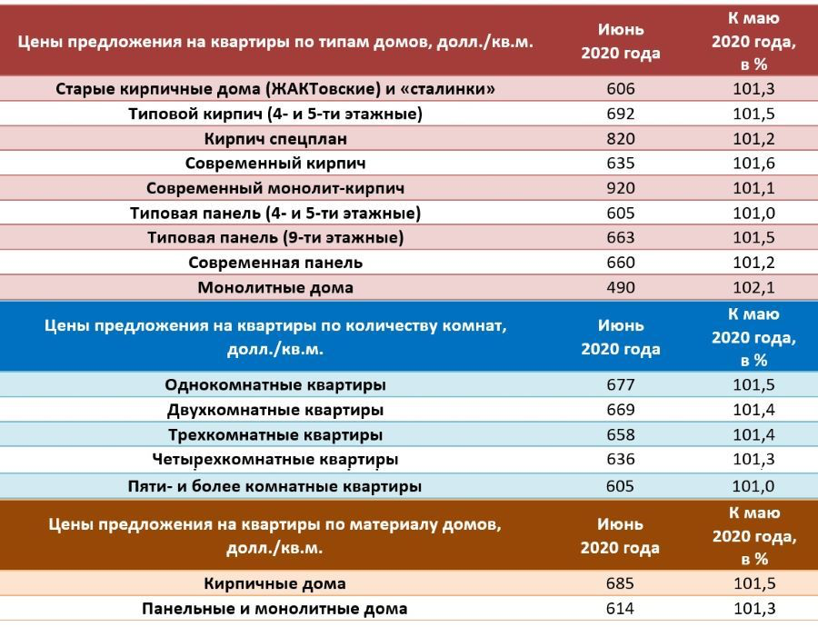 В июне 2020 года цены на квартиры, расположенные в старых кирпичных домах, повысились на 1,3% до 606 долларов/кв.м. В 4-х и 5-ти этажных кирпичных домах типовой планировки СЦП увеличилась за июнь 2020 года на 1,5% (692 доллара/кв.м.) В 4-х и 5-ти этажных панельных домах типовой планировки СЦП увеличилась за июнь 2020 года на 1,0% - до 605 долларов/кв.м. В панельных девятиэтажных домах типовой планировки средняя цена предложения за июнь 2020 года повысилась на 1,5% - до 663 долларов/кв.м.