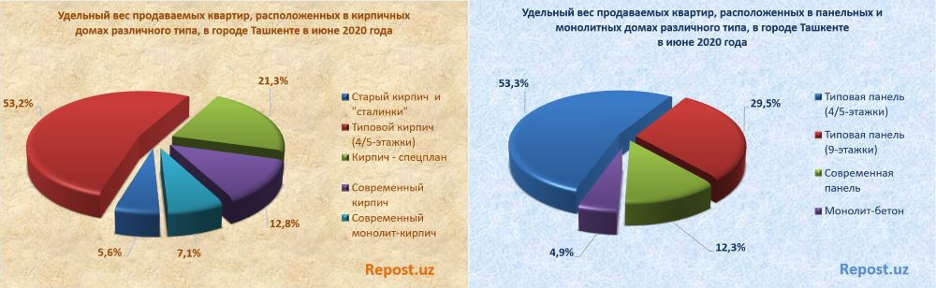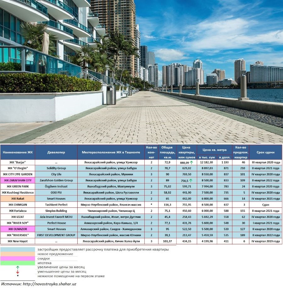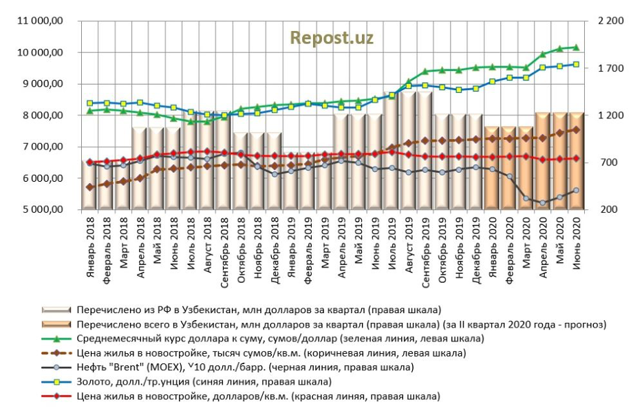 Из-за резкой девальвации сума 14-16 апреля цена предложения в новостройках снизилась на 4,3% - до 733 долларов/кв.м. В июне 2020 года наблюдалось повышение цен в сумах на предлагаемое к реализации жилье. В среднем по рынку новостроек прирост составил 1,4% (7 552 млн сумов/кв.м.) 28% этого прироста произошло за счет снижения курса национальной валюты к доллару. Остальное повышение можно объяснить тем, что два застройщика сдали объекты в эксплуатацию и подняли цены на оставшееся нереализованное жилье, а также повышением биржевых цен на цемент, вызванного введённым запретом на импорт цемента из других стран на период с 1 мая по 31 декабря 2020 года (через три недели запрет был отменен).