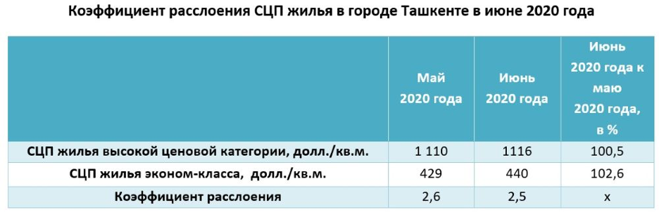 Коэффициент расслоения (отношение СЦП жилья высокой ценовой категории и жилья эконом-класса) в июне 2020 года составил 2,5 (в предыдущем месяце было 2,6).