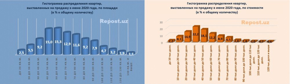 Почти 55% квартир, выставленных на продажу в июне 2020 года, имели общую площадь от 40 до 79 квадратных метров. Это средняя площадь типовых двух- и трехкомнатных квартир. Именно этот сегмент занимает 55,2% квартирного рынка с ценами продаж 20 – 49 тысяч долларов: 14,9% занимают квартиры с ценами предложения от 20 до 30 тысяч долларов; 22,2% - с ценами предложения 30-39 тысяч долларов и 18,1% - от 40 до 50 тысяч долларов.