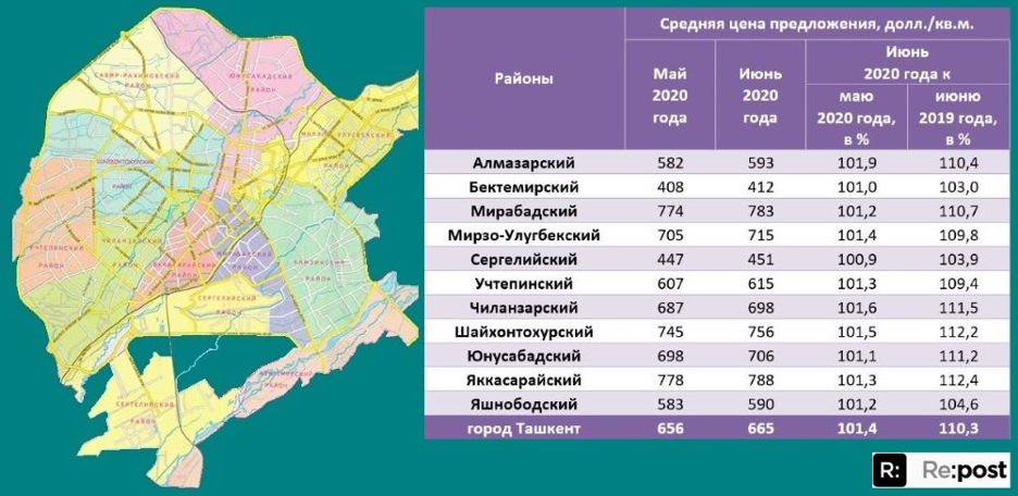 В июне 2020 года в Ташкенте наблюдалось однонаправленное повышательное движение цен предложения по районам. Наибольший рост за месяц показала СЦП в Алмазарском районе (1,9%), а наименьший наблюдался в Сергелийском (0,9%) и Бектемирском (1,0%) районах.