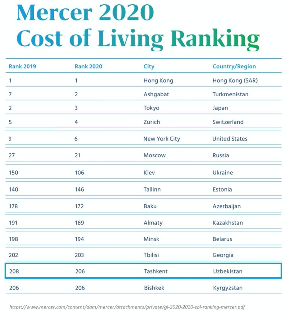 Кроме Ташкента, дешевле всего для иностранных специалистов жить в Бишкеке, Виндхуке в Намибии, а также Тунисе. «В связи с COVID-19 социальные и экономические сложности подтолкнули организации на переоценку их глобальных программ по трудовой мобильности с обращением особого внимания на благосостояние их сотрудников-экспатов», - говорится в исследовании Mercer.