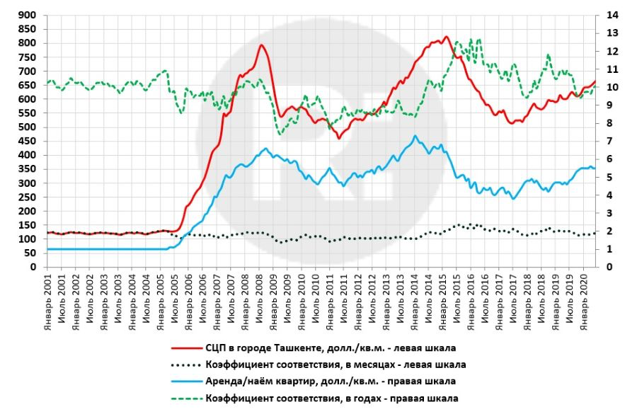 Если следовать американскому методу, то средняя стоимость найма квартиры в Ташкенте в июне 2020 года должна составлять 5,65 доллара/кв.м., что несколько выше фактически сложившегося показателя (5,5 доллара/кв.м.)