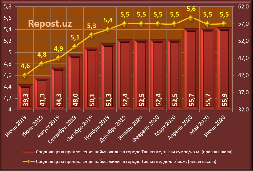 - Средняя стоимость найма квартир в июне 2020 года в Ташкенте сохранилась на уровне 5,5 доллара/кв.м. В национальной валюте стоимость найма квартир увеличилась по сравнению с маем на 0,3% и составила (55,9 тысячи сумов/кв.м).