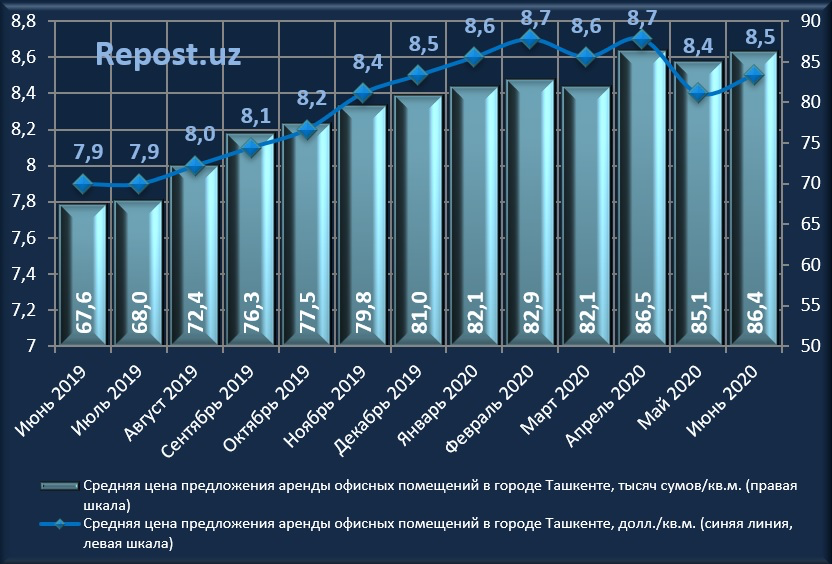 - Средняя стоимость аренды офисов в июне 2020 года в столице повысилась до 8,5 доллара/кв.м. (месячный темп прироста составил 1,2%) или до 86,4 тысячи сумов/кв.м. (темп прироста в сумовом выражении составил 1,5% за месяц).
