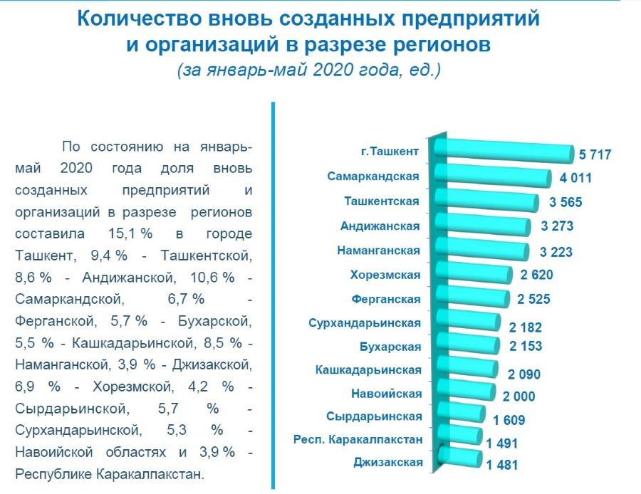 Наблюдается повышение активности по организации новых предприятий и организаций в Ташкенте. Если по состоянию на 1 апреля 2020 года количество вновь созданных предприятий и организаций в столице достигло 4 619 (19,2% всех организованных предприятий в республике), то на 1 мая этот показатель увеличился всего до 4 806 (прирост 4%).