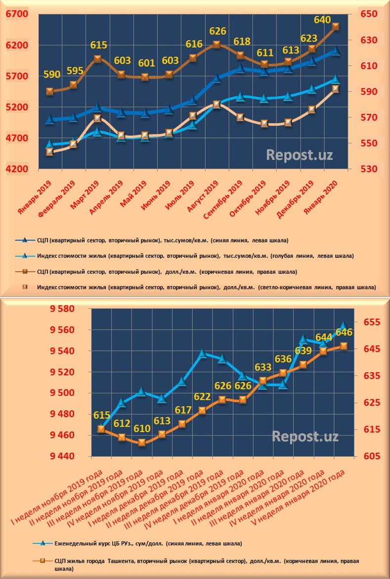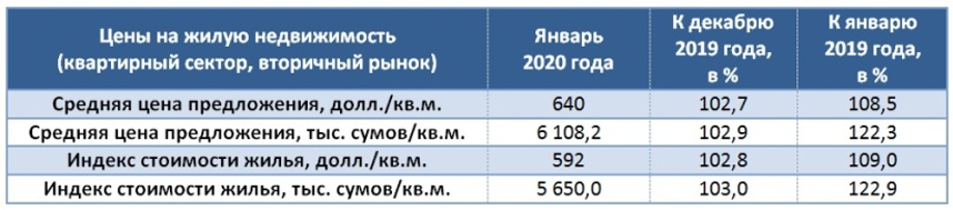 - Индекс стоимости жилья в квартирном секторе (вторичный рынок) в январе 2020 года в столице составил 592 доллара/кв.м. (темп прироста по сравнению с декабрем 2019 года составил 2,8%) или 5 650 тысяч сумов/кв.м. (темп прироста по сравнению с предыдущим месяцем составил 3,0%).