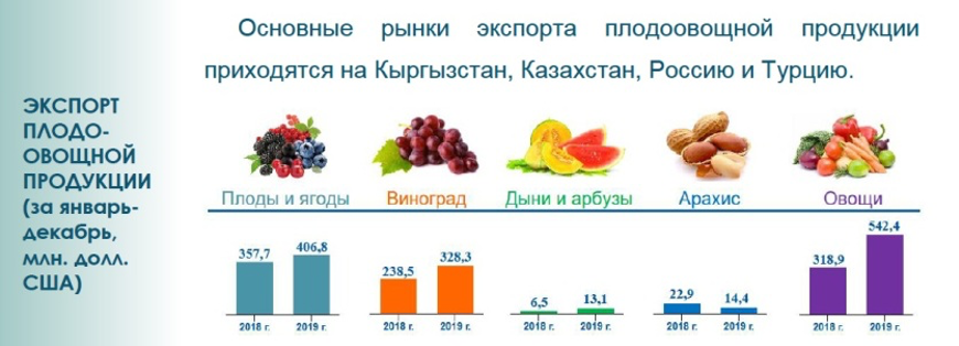 Одним из факторов поддержки вторичного рынка жилья является рост объемов вывоза плодов, ягод и овощей за пределы республики. По данным Госкомстата за 2019 год объем экспорта плодоовощной продукции в натуральном выражении составил более 1,4 млн тонн и в стоимостном выражении превысил 1,2 млрд долларов (темпы роста по сравнению с 2018 годом составили, соответственно, 112,7% и 135,5%). Из них было экспортировано более 816,5 тыс тонн овощей на сумму 542,4 млн долларов, а также 591,2 тыс тонн плодов и ягод на сумму 658,1 млн долларов (темпы роста в стоимостном выражении по сравнению с 2018 годом составили, соответственно, 170,1% и 116,1%).