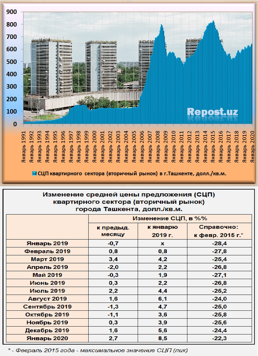 - Средняя цена предложения жилья в квартирном секторе (вторичный рынок) в январе 2020 года в Ташкенте составила 640 долларов/кв.м. (темп прироста по сравнению с декабрем 2019 года составил 2,7%) или 6 108,2 тысячи сумов/кв.м. (темп прироста по сравнению с предыдущим месяцем составил 2,9%).