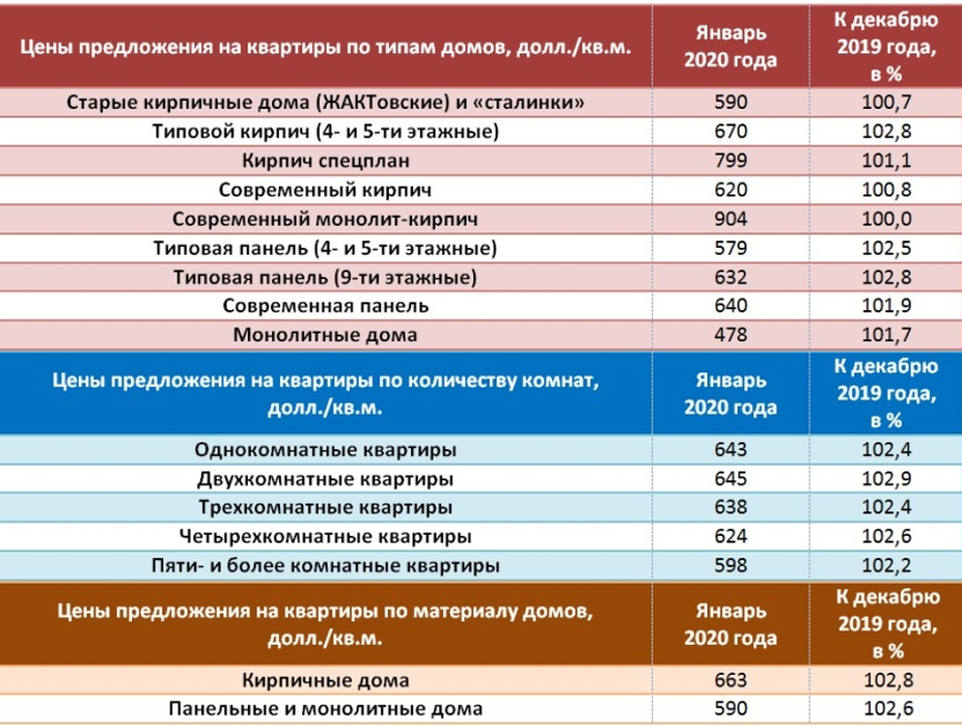 В январе 2020 года цены на квартиры, расположенные в старых кирпичных домах, выросли на 0,7% и достигли 590 долларов/кв.м. В 4-х и 5-ти этажных кирпичных домах типовой планировки СЦП увеличилась за январь 2020 года на 2,8% (670 долларов/кв.м.) В 4-х и 5-ти этажных панельных домах типовой планировки СЦП увеличилась за январь 2020 года на 2,5% (579 долларов/кв.м.) В панельных девятиэтажках средняя цена предложения за январь 2020 года увеличилась на 2,8% - до 632 долларов/кв.м.