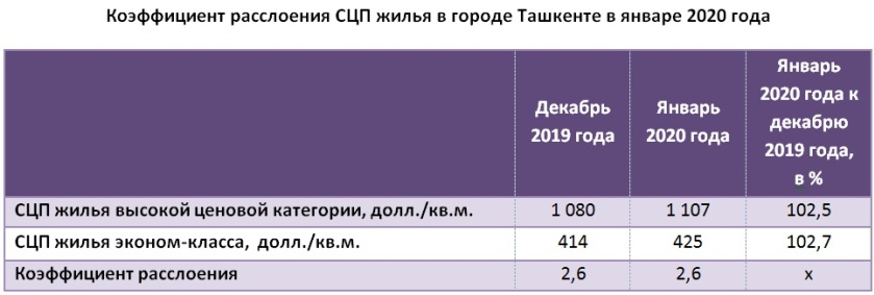 Коэффициент расслоения (отношение СЦП жилья высокой ценовой категории и жилья эконом-класса) в январе 2020 года составил 2,6 (сохранился на уровне декабря 2019 года).