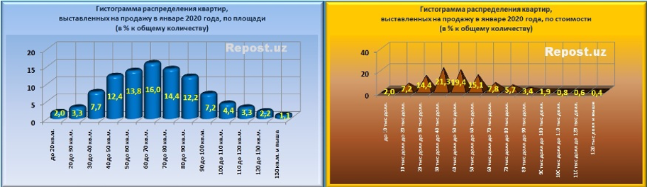 Почти 57% квартир, выставленных на продажу в январе 2020 года, имели общую площадь от 40 до 79 квадратных метров. Это средняя площадь типовых двух- и трехкомнатных квартир. Именно этот сегмент занимает более 55% квартирного рынка с ценами продаж 20 – 49 тысяч долларов: 14,4% занимают квартиры с ценами предложения от 20 до 30 тысяч долларов; 21,3% - с ценами предложения 30-39 тысяч долларов и 19,4% - от 40 до 50 тысяч долларов.