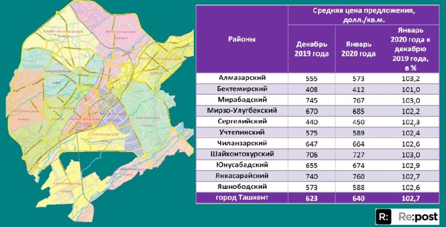 В январе 2020 года в Ташкенте наблюдалось однонаправленное повышательное движение цен предложения по всем районам. Наибольший рост за месяц показала СЦП в Алмазарском (3,2%), Мирабадском и Шайхонтохурском - по 3% - районах.