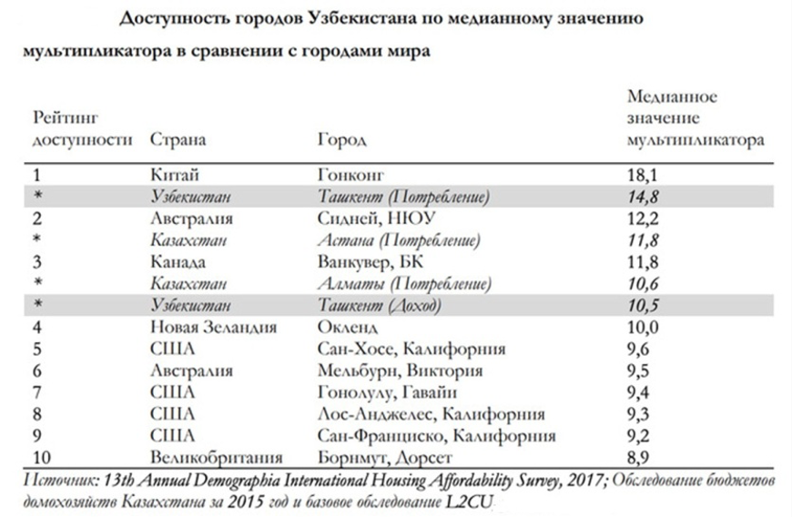 С точки зрения оценки стоимости жилья, город Ташкент менее доступен по цене, чем многие городские агломерации, такие как Сан-Франциско в США или Ванкувер в Канаде.