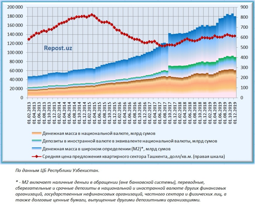 Видно, что увеличение наличной денежной массы до сентября 2017 года (с марта 2015 года по август 2017 года агрегат М2 вырос с 32,7 до 60 трлн сумов) не оказывало влияния на снижение цен столичного вторичного рынка жилья (с марта 2015 года цены продолжали снижаться). В сентябре 2017 года объем наличных денег в обращении резко вырос (на 19% или до 71,3 трлн сумов): Центральный банк Узбекистана установил с 5 сентября 2017 года курс доллара США к национальной валюте на уровне 8 100 сумов. Это на 3 889,65 сума выше курса предыдущей недели (4210,35 сума).