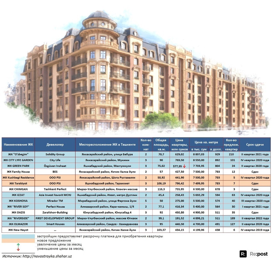 В связи с резким ослаблением национальной валюты в августе 2019 года некоторые застройщики повысили цены в сумах до 10%. Кроме того, с приближением срока ввода здания в эксплуатацию девелоперы, как правило, повышают цены.