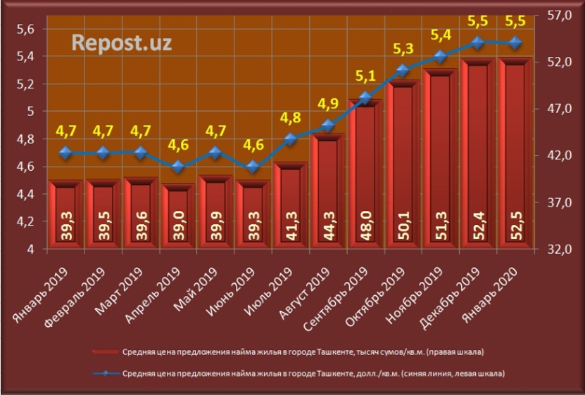 - Средняя стоимость найма квартир в январе 2020 года в Ташкенте составила 5,5 доллара/кв.м. (на уровне декабря 2019 года) или 52,5 тысячи сумов/кв.м. (месячный темп прироста в сумовом выражении составил 0,2%).