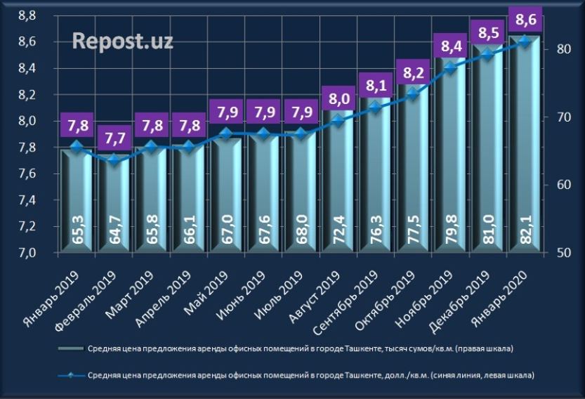 В январе 2020 года средняя стоимость аренды офисных помещений в столице выросла на 1,2% до 8,6 доллара/кв. м. общей площади. В сумовом выражении размер аренды офисов увеличился на 1,4% и достиг 82,1 тысячи сумов/кв.м. общей площади.