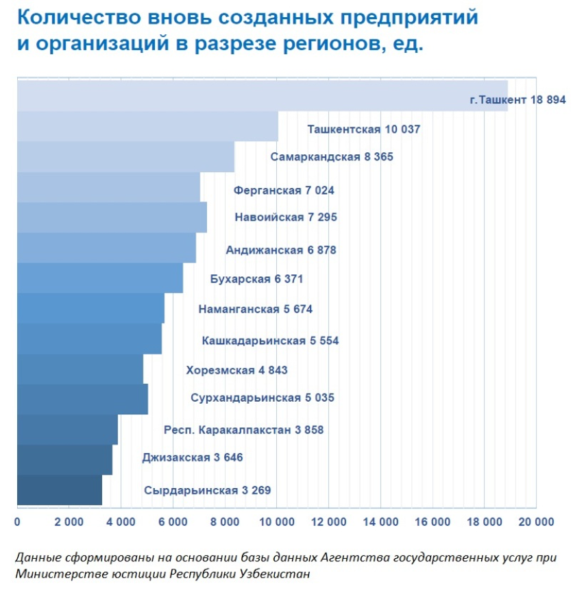 Основная причина – это проведение либерализации и прогрессивных преобразований в политической, экономической, культурной и других сферах общественной жизни за последнее время. По состоянию на 1 января 2020 года в Ташкенте было создано 18 894 предприятий и организаций.