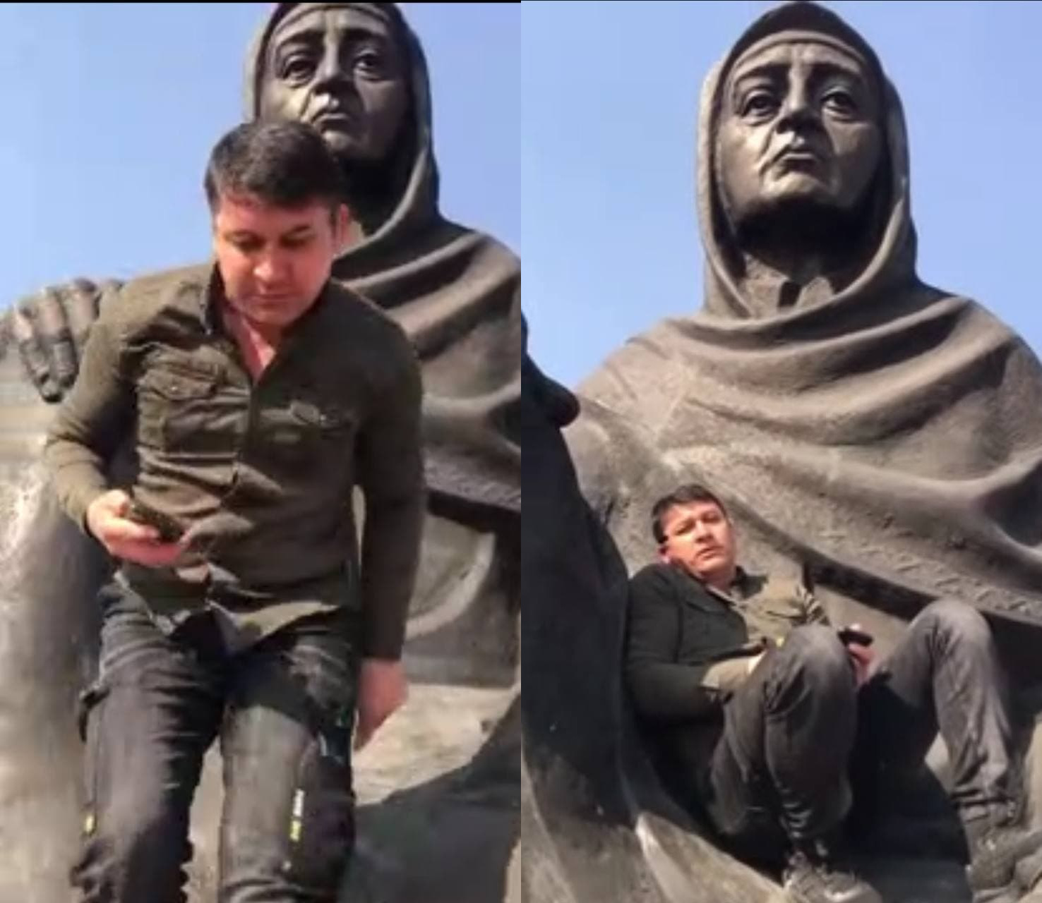 На видео видно, как он лежит на руках статуи Скорбящей матери, и неуважительно говорит: «Я лежу на руках матери, я не знаю, кто она».
