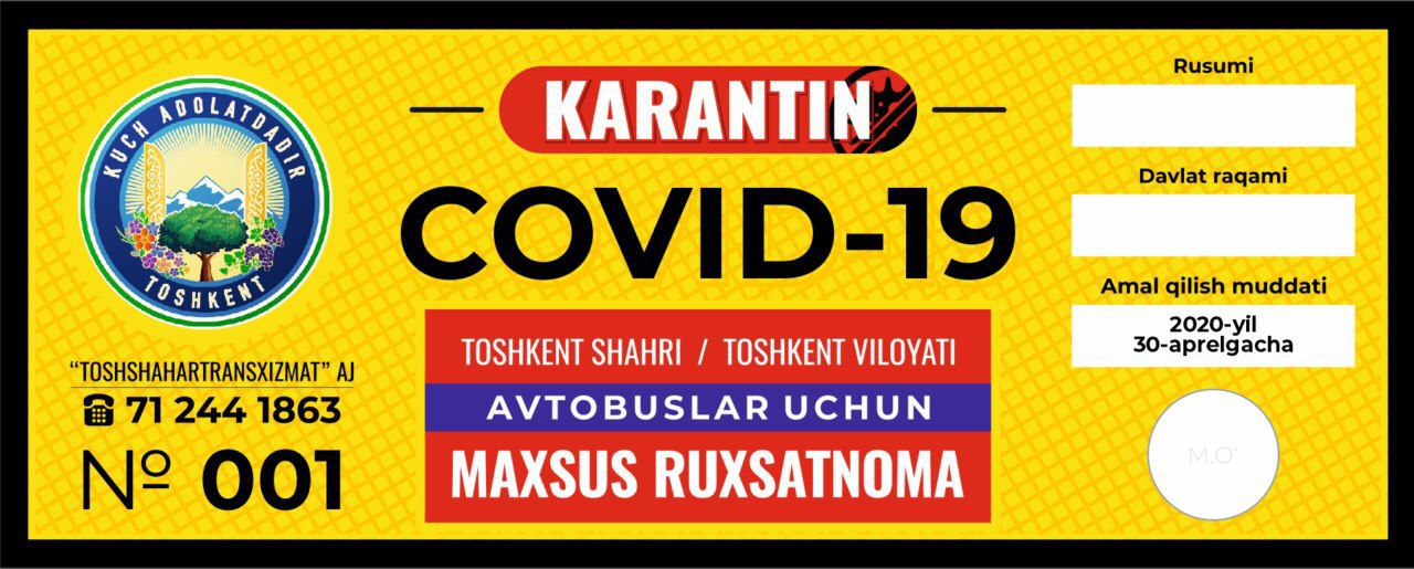 Предприятиям и организациям, действующим в Ташкенте 23 марта было принято решение прекратить въезд в город Ташкент из других регионов республики на любых транспортных средствах (автобус, автомобиль, авиаперелёты и железная дорога) и выезд из города Ташкента в другие регионы республики.
