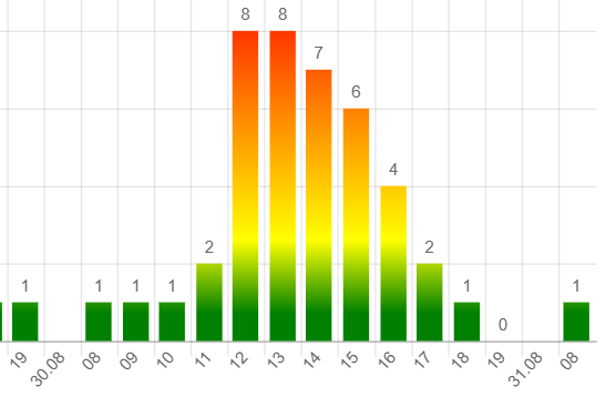 Восьмибалльный показатель будет наблюдаться в 12:00-13:00. Снижение прогнозируется ближе к 14:00.