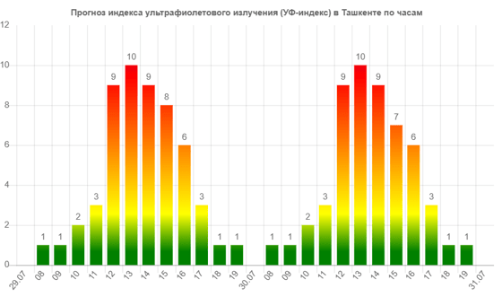 Согласно прогнозу, 10-балльный показатель будет наблюдаться в 13:00. После этого уровень начнет постепенно снижаться. Завтра (30 июля) ожидается похожая ситуация.