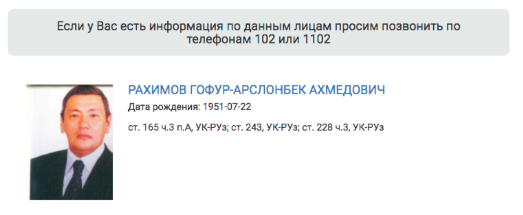 На официальном сайте МВД Узбекистана появилась информация о розыске Рахимова Гафура-Арсланбека Ахмедовича. Сообщается о том, что он обвиняется в вымогательстве, легализации доходов, полученных от преступной деятельности, а также в подделке документов или их использовании.