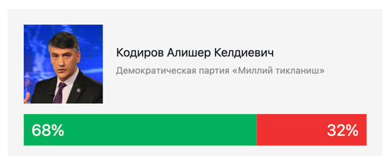 На втором месте оказалась Робахон Махмудова из Социал-демократической партии «Адолат» (79%), на третьем – Актам Хаитов из Либерально-демократической партии (УзЛиДеП) – 75%.