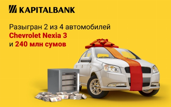 15 ноября в прямом эфире «Капиталбанк» разыграл второй главный приз розыгрыша по вкладам — Chevrolet Nexia 3. Обладателем нового автомобиля стал вкладчик банка Бражников Виталий из Ташкента. Победителями денежных призов стали участники розыгрыша из Ташкента, Бухары, Каракалпакстана и Самарканда.