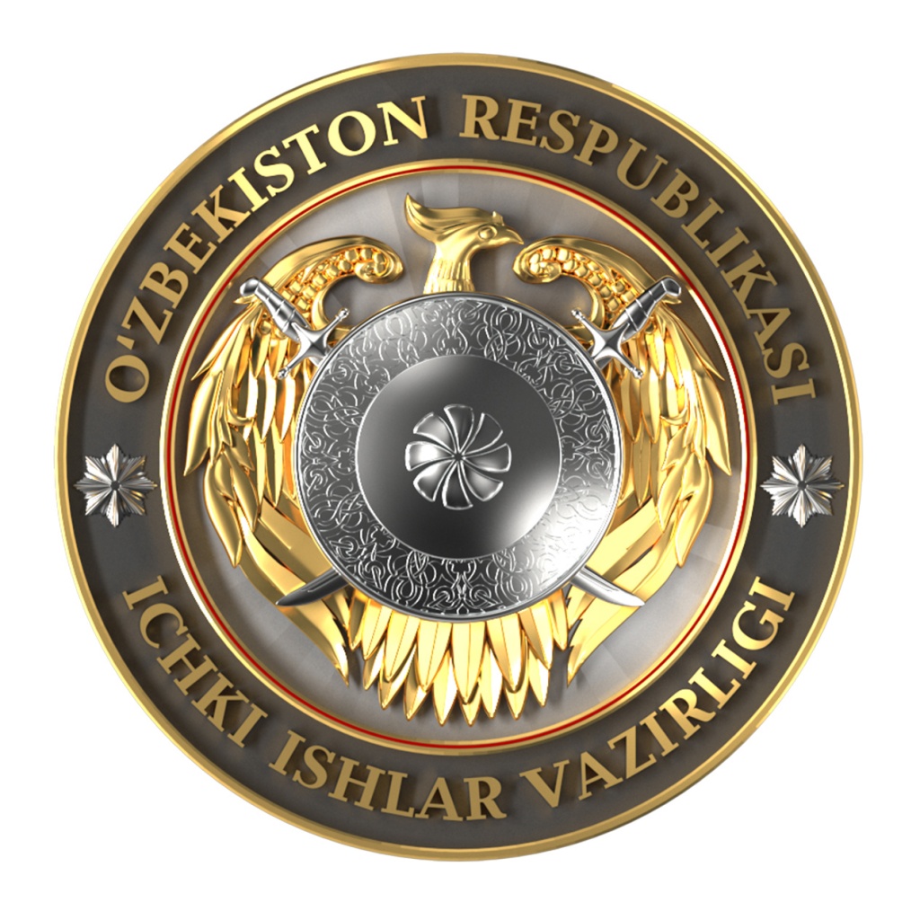 На кольцевой полосе сверху надпись бронзовыми прямыми литерами латинского алфавита: «O’ZBEKISTON RESPUBLIKASI», снизу: «ICHKI ISHLAR VAZIRLIGI». Надписи разделены между собой двумя восьмиконечными звездами, символизирующими знак утверждения, непреклонность и честь.