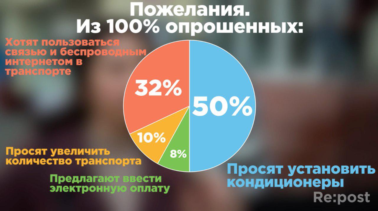 Согласно результатам опроса, 50% указали на необходимости установки кондиционеров, 32% желают пользоваться бесплатным Wi-Fi, 10% выступили за увеличение количества транспорта, а 8% назвали в качестве пожелания введение системы электронной оплаты.