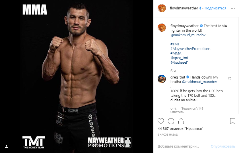 12 августа американский боксер Флойд Мейвезер назвал узбекского бойца ММА самым с лучшим в мире. Об этом он сообщил на своей странице в Instagram.