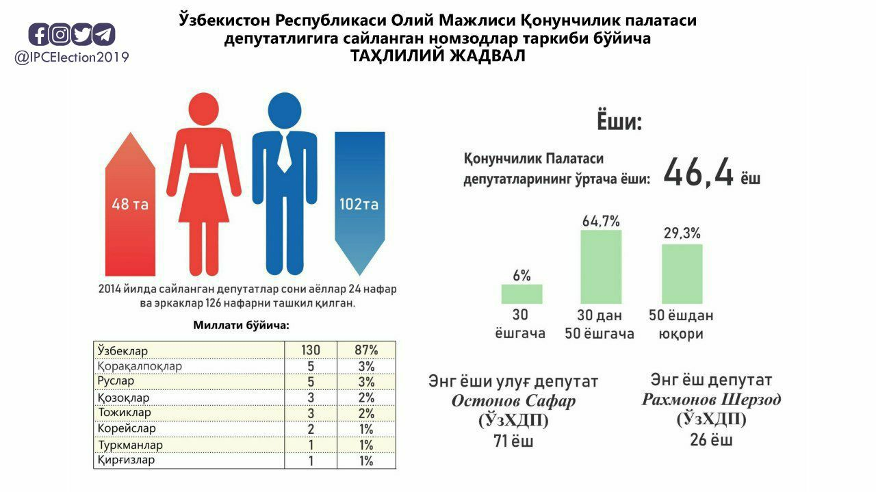 Согласно результатам голосования средний возраст депутата 46. Самым молодым депутатом стал Рахмонов Шерзод от партии «НДПУ».